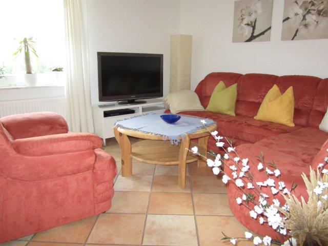 Wohnzimmer, Küche, Bad und Flur sind gefliest und